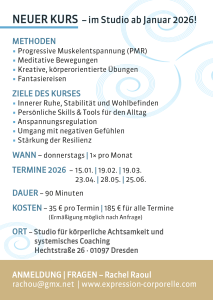 Für einen sicheren Halt zu sich selbst und zum Gegenüber werden Sie Stabilität, Bodenständigkeit und Selbstvertrauen erspüren und festigen. Darauf aufbauend möchte ich mit Ihnen durch interaktive und spielerische Übungen Empathie und Einfühlsamkeit stärken, um loszulassen. In der Gruppe kann sich ein Gefühl von Zusammenhalt und von Verbindungen entwickeln.Was im Körper festgehalten wird, drückt sich durch Verspannungen und Blockaden aus. Daraus können Gefühle von Beklemmung, Hilflosigkeit und Unbeweglichkeit entstehen. Um sie abzuschwächen, biete ich Ihnen Entspannungsverfahren zur Lockerung und Entspannung.